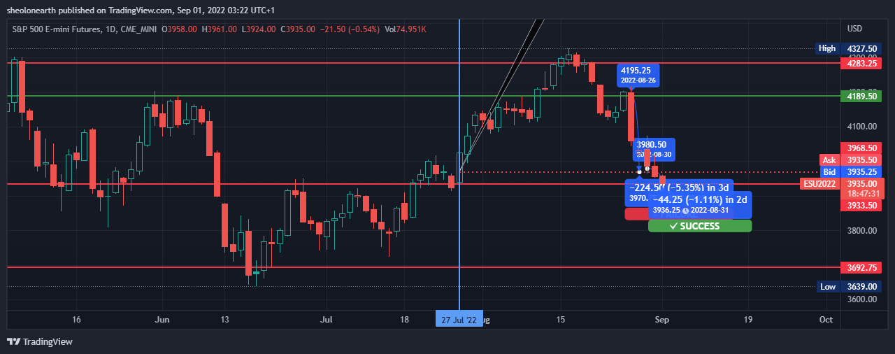 The Powell 'Put' has been breached at 3968, whilst the technical support of 3933 is still holding, but only just, which is quite amazing if you think about how the 27th July 'Put' support was given after Jerome Powell's ambiguity in offering any clear market direction on inflation and recession, after the Fed gave its July 0.75% rate rise, markets rallied and by metaphor a 'put' was created, Until after the Fed's Jackson Hole meeting (26th August), which indicated to the market that the Fed simple cannot drag their feet on rate rises as inflation in America may start to spiral out of control and the U.S. government has run of options re: Strategic Petroleum Release and lowering the price of fuel at the pump. Markets therefore tanked, as a blunt direction was given by Powell and the Fed. Rates have too go up.